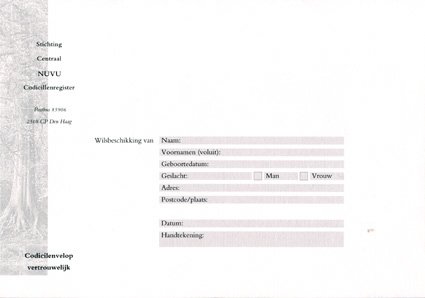 - enveloppen in twee formaten (elk 2 exemplaren), een speciale codicilenvelop (2 exemplaren) [afbeelding] en adresstickers (2 exemplaren)